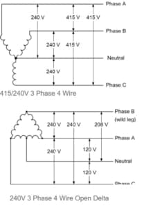 How to obtain 120V or 240V single phase from some three phase supply – see diagrams on the right.